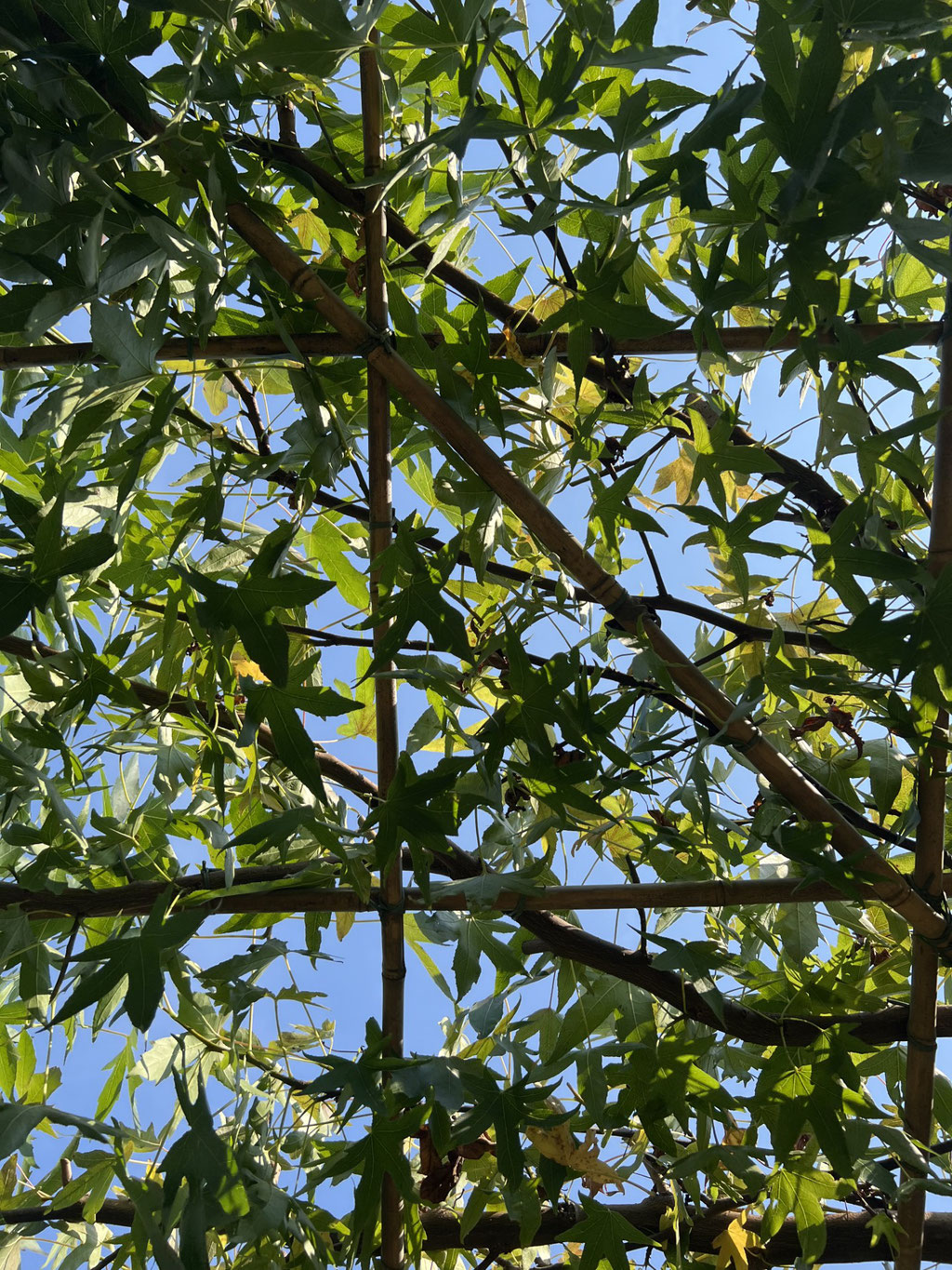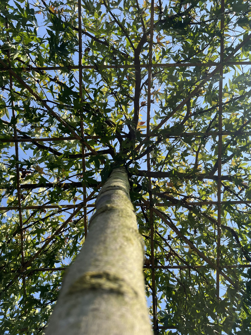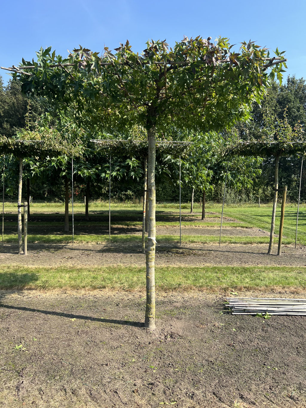 Deze amberboom heeft diep ingesneden, frisgroene bladeren die in de herfst verkleuren naar een palet van oranje, rood en purper. De schors is grijsbruin en ontwikkelt met de jaren een gegroefde