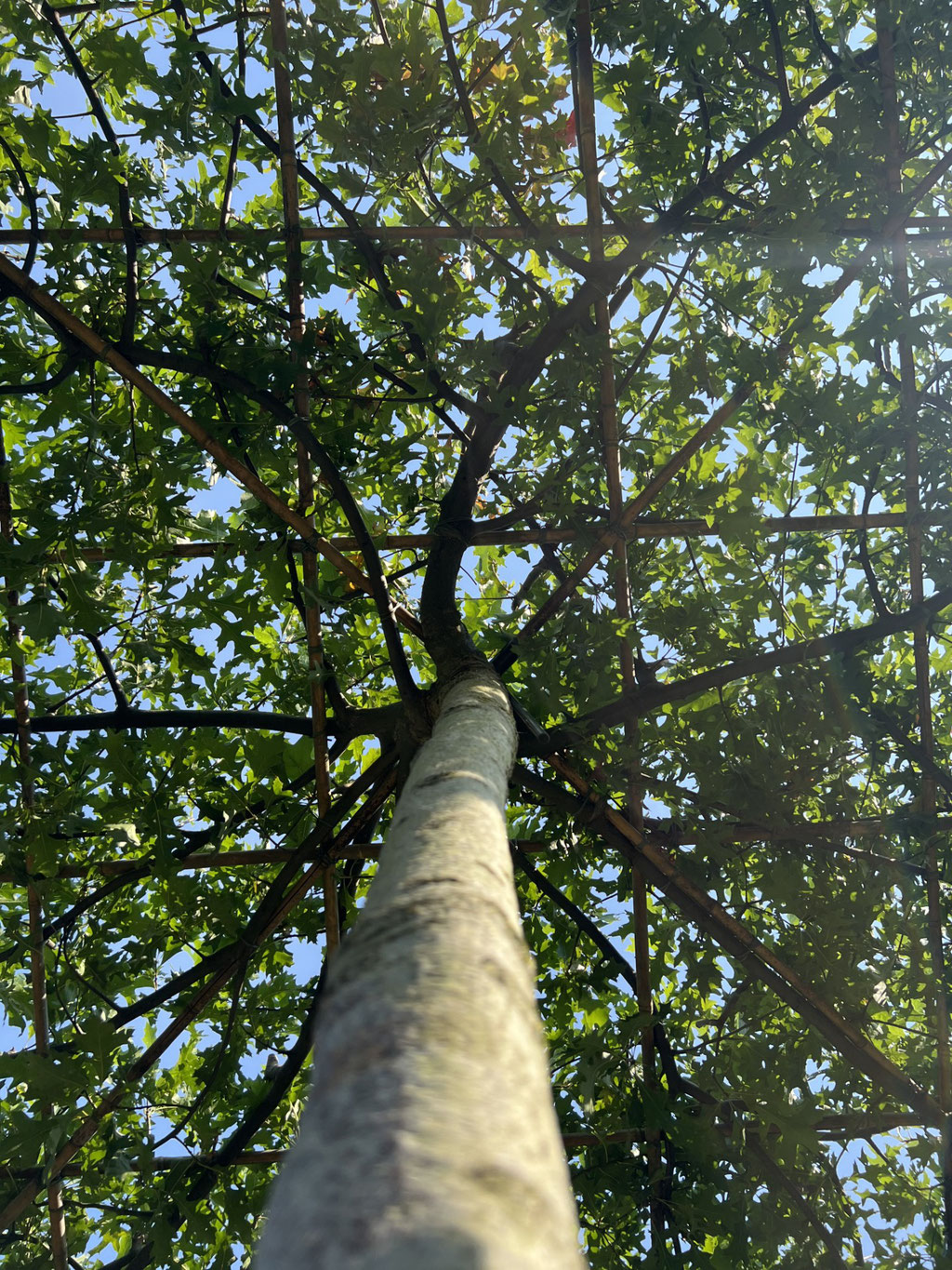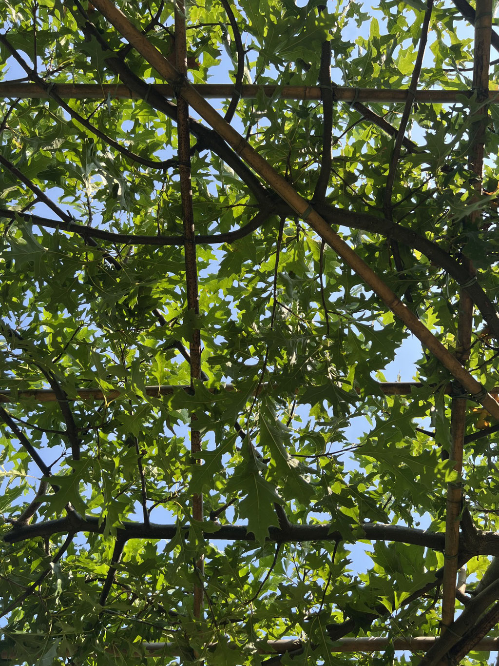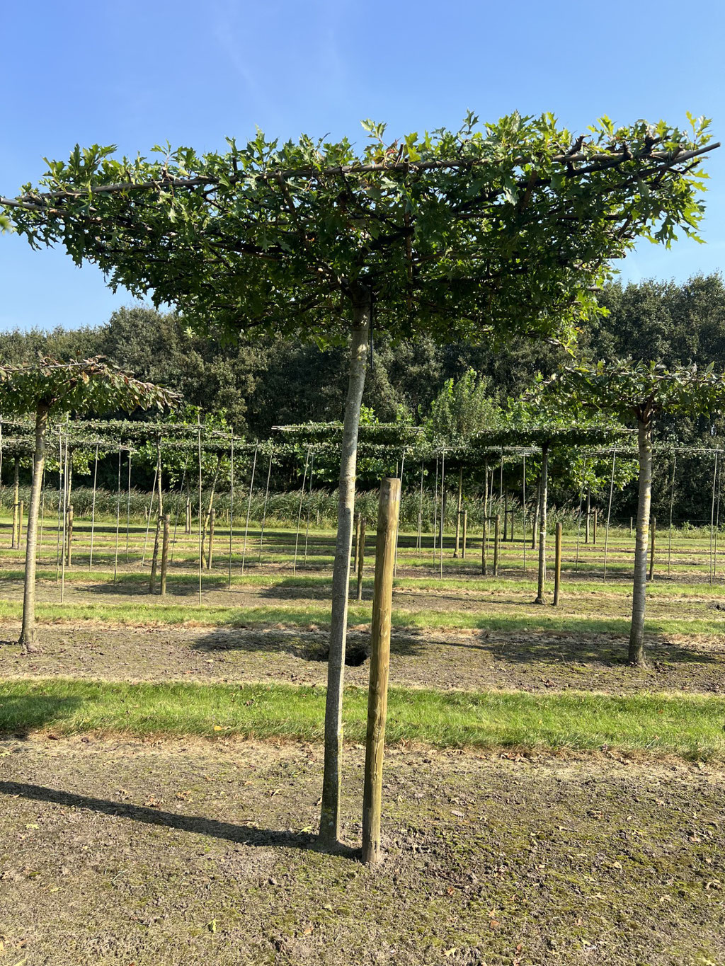 De moeraseik heeft diep ingesneden, frisgroene bladeren die in de herfst verkleuren naar een intens rood. De takken groeien elegant afhangend, wat de boom een kenmerkende vorm geeft. Het is een vitale en krachtige soort.