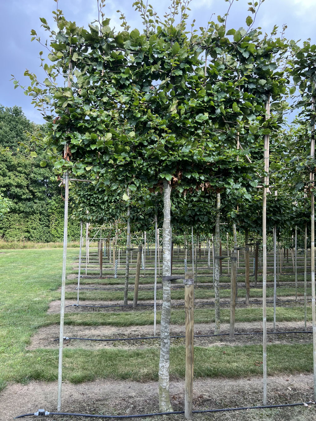 De groene beuk draagt frisgroen blad dat in de herfst naar goudbruin kleurt. Ook in de winter blijven de verdorde bladeren vaak aanwezig, wat de boom extra structuur geeft. Het is een sterke soort met een rijke uitstraling.